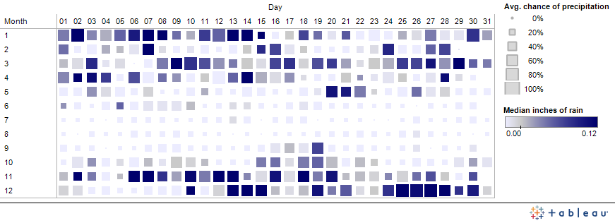 - For my use at least, the most important thing is that I can quickly look across this and compare individual days or broader times of year. I had originally intended to make this as a single line graph, with a whole year across the x axis and the chance of rain each day on the y, but I found this view in Tableau much easier to read as a calendar.